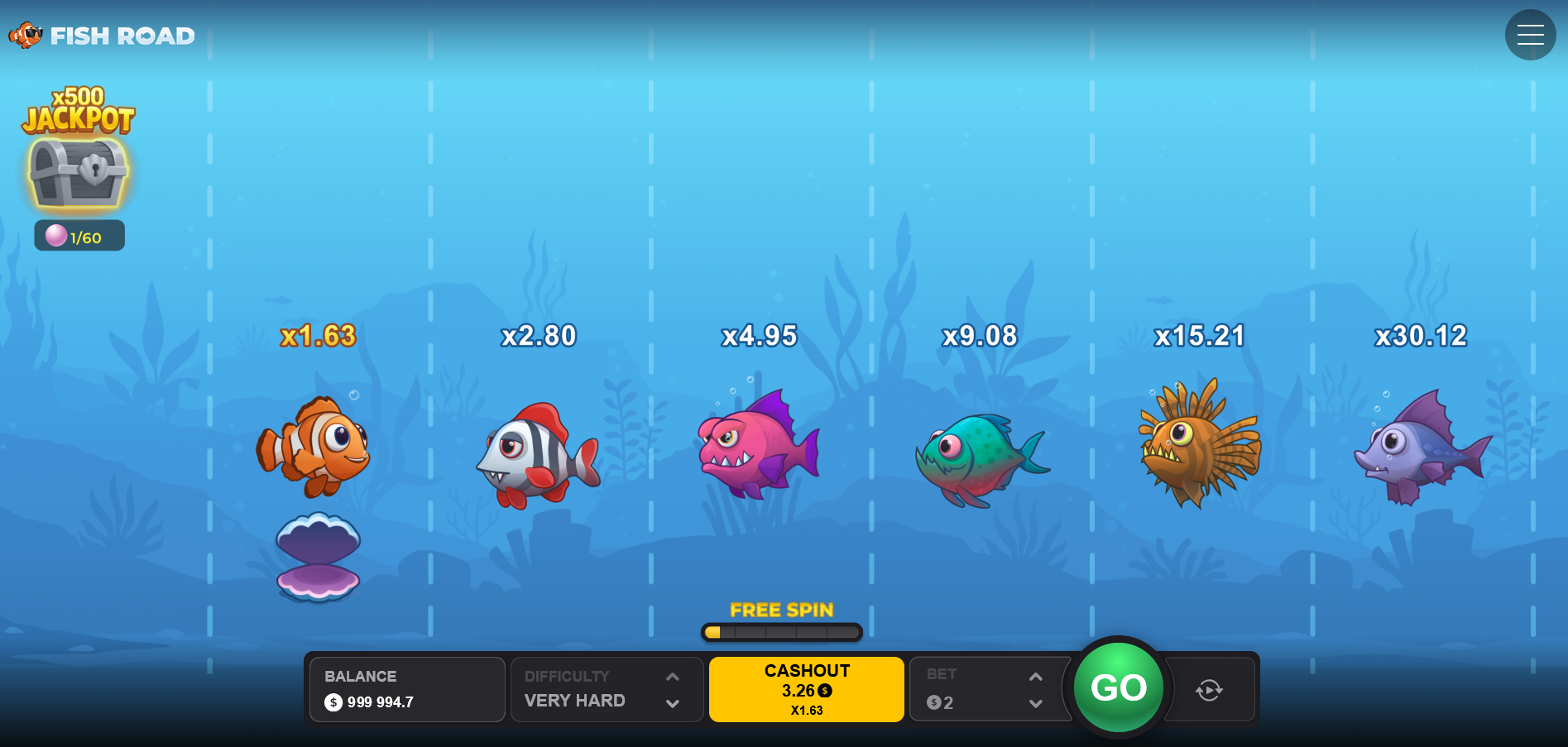 Fish Road es una emocionante aventura subacuática que combina suerte y estrategia. Guía a tu valiente pez a través de diferentes niveles de dificultad, recolectando multiplicadores en cada paso y evitando a los peces enemigos. Aprovecha funciones innovadoras como el Jackpot Shells, Free Spins a través del Bet Bar y la posibilidad de ganar un gran premio en el Big Chest. Cada partida trae nuevas oportunidades y sorpresas para ganar a lo grande.